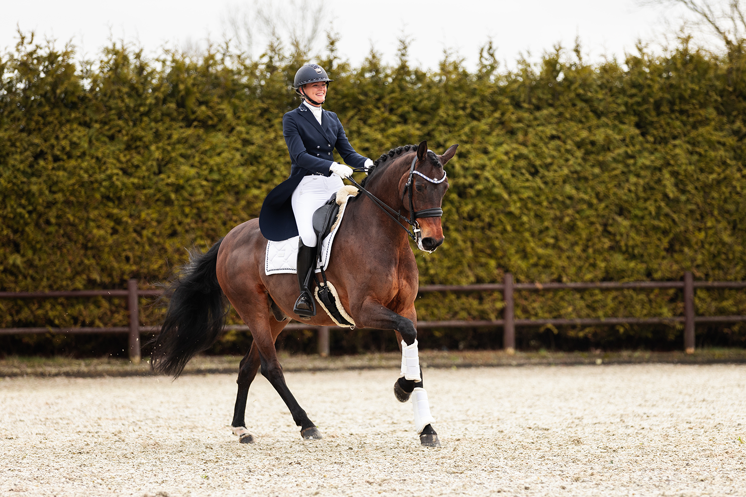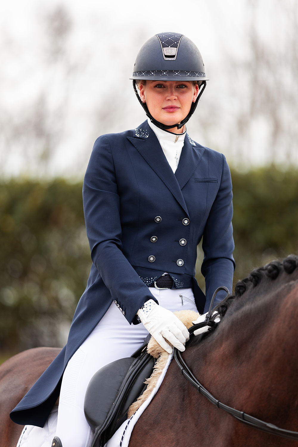 My elegant competition jackets from JuulC are perfect. I have both the short jacket and the tailcoat. These jackets feature chic details and are exceptionally comfortable to wear thanks to the merino wool with stretch. The jackets stand out for their luxurious, feminine look and tailored fit, which makes me feel confident in the ring. After a test, the jackets can easily be wiped down with a damp cloth if needed and are ready to wear again. This makes the jackets functional as well.